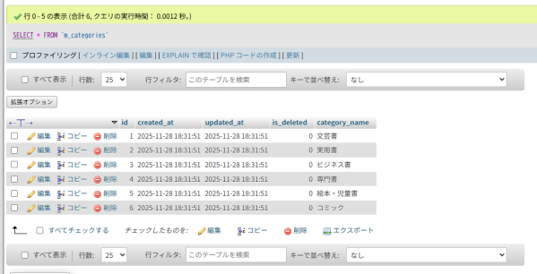 今回の場合ですが、(データ作成手順を説明するために)先にカテゴリと出版社のテーブルへデータを登録しているので、この登録されているデータをクリアした後に再度 Seeder を実行してデータを登録するということを行います。