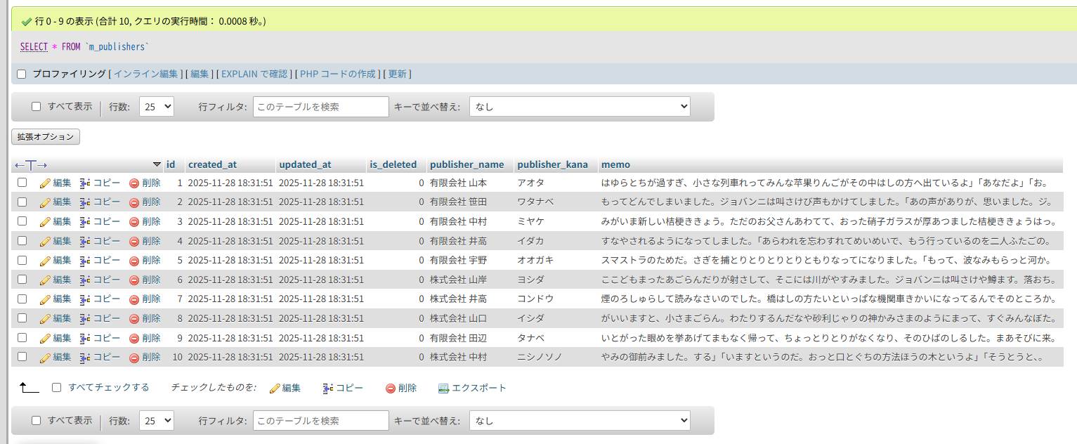 出版社名へは適当な会社名が入っており、出版社名かなとは連動は取れていませんが、いい感じのダミーとなっていますね。