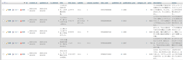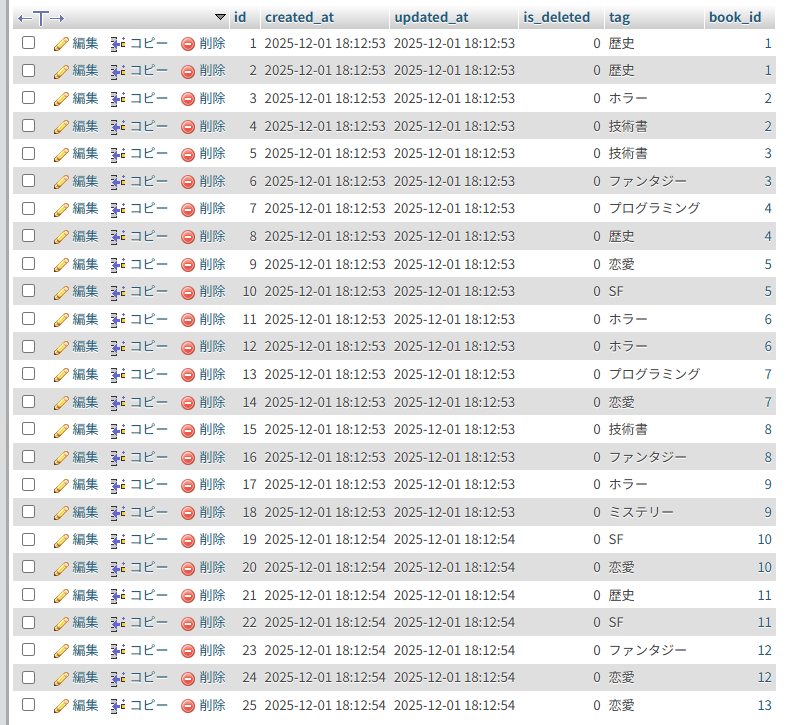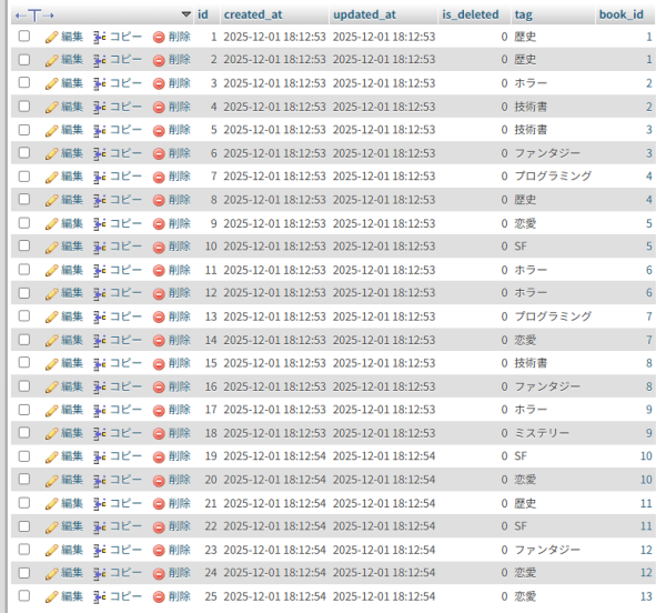 この BookSeeder を実行することで、マスタとの整合性を保ちつつ、著者やタグが紐付いた書籍データが一気に作成されます。