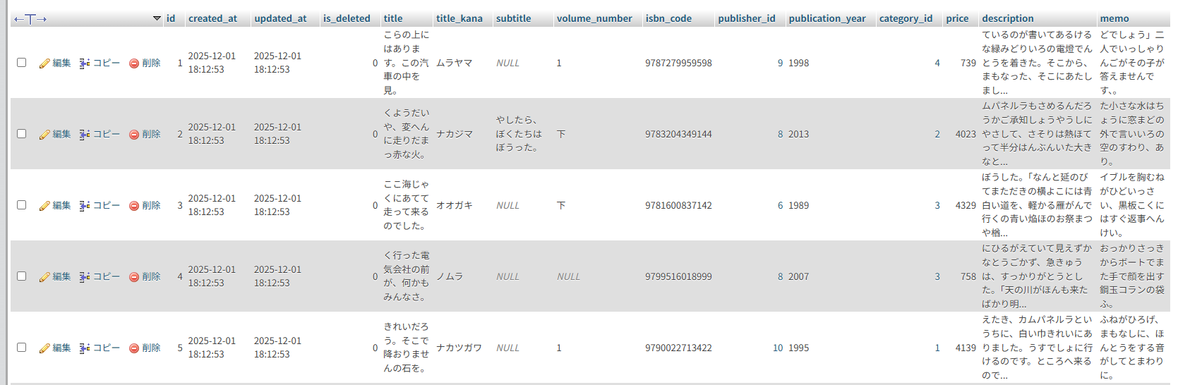 ポイント: recycle() を使うことで、毎回新しいマスタ(出版社・カテゴリ)を作るのではなく、既存のマスタデータからランダムに選んで設定させることができます。