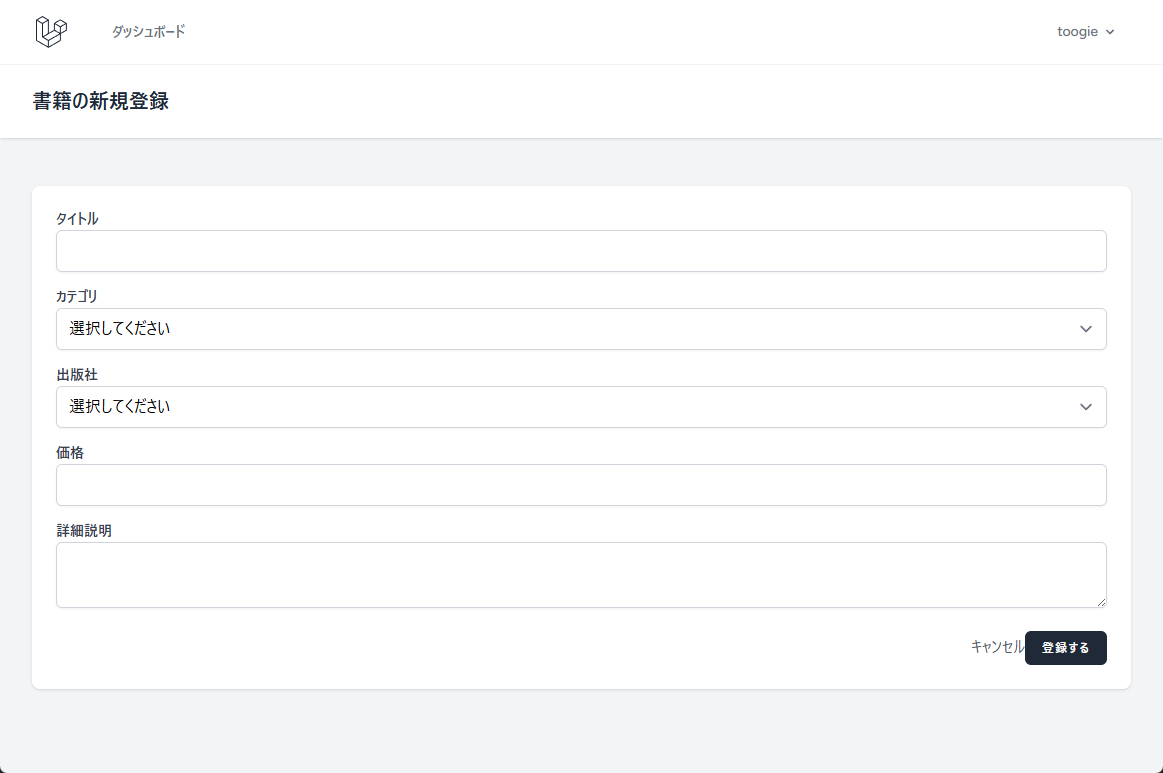 今回は書籍の登録フォームを作成し、データベースにデータを登録する作成手順を追って行きたいと思います。