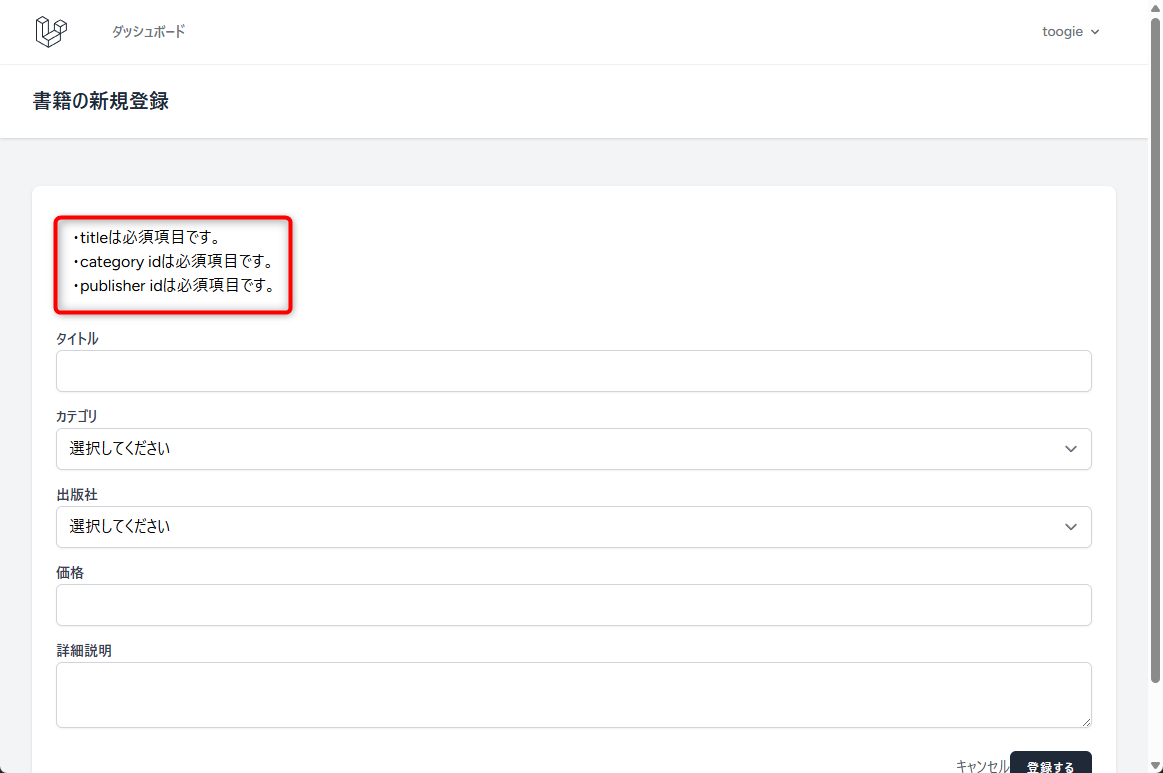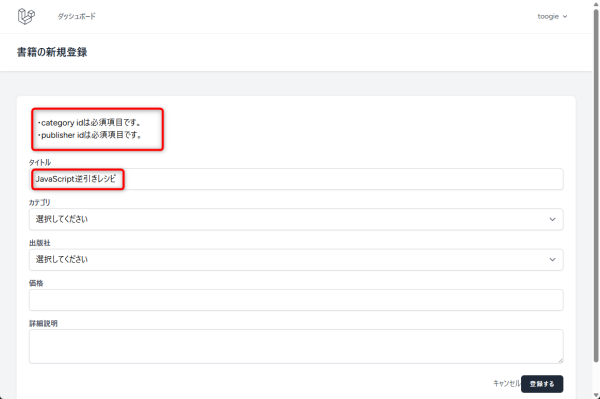 タイトル、カテゴリ、出版社のバリデーションエラーとなります。